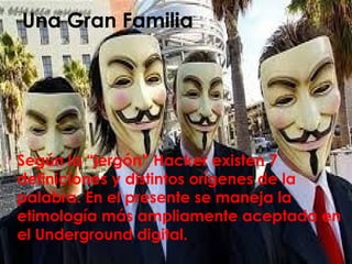 El documento examina diversas categorías dentro del ámbito del hacking, incluyendo hackers, crackers, phreakers, y otros, cada uno con diferentes intenciones y niveles de habilidad. También se discute la ética hacker y la importancia de la programación y el conocimiento del sistema operativo Unix. Se concluye que los hackers buscan la investigación y la mejora de sistemas sin causas maliciosas, mientras que otros términos como piratas informáticos y lamers se asocian con acciones negativas.