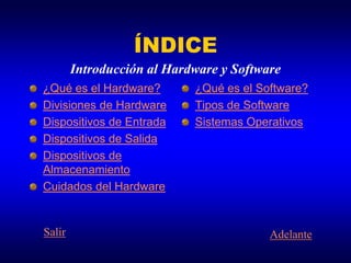 Este documento presenta una introducción al hardware y software de computadoras. Explica que el hardware se refiere a las partes físicas y tangibles de una computadora como el teclado, monitor y unidad de disco, mientras que el software son programas como sistemas operativos. Además, divide el hardware en dispositivos de entrada, salida y almacenamiento y lista algunos ejemplos comunes de cada tipo.