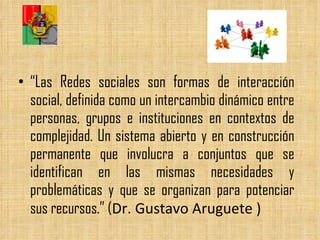 Este documento describe las redes sociales, su historia y cómo funcionan. Define una red social como una forma de interacción social dinámica entre personas e instituciones. Explica que las primeras redes sociales surgieron a principios de los 2000 y que Facebook se hizo popular entre los estudiantes. También describe cómo las herramientas de integración como Twitter y Flickr permiten compartir contenido entre plataformas y cómo las redes sociales ahora se pueden usar desde diferentes dispositivos.