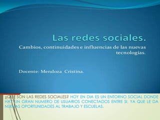 Este documento resume las redes sociales. Explica que las redes sociales son entornos sociales donde hay muchos usuarios conectados entre sí, lo que brinda nuevas oportunidades para el trabajo y la educación. También discute las perspectivas tecnológicas y didácticas necesarias para el aprendizaje en las redes sociales, y enfatiza la importancia de enseñar a los jóvenes y estudiantes a usar las redes de manera apropiada. Finalmente, concluye que las redes sociales tienen ventajas como mantener