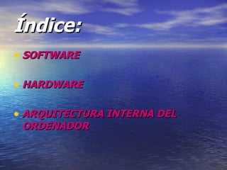 El documento describe los componentes básicos de hardware y software de una computadora. Explica que el hardware incluye la placa base, tarjetas de expansión, memoria, unidad central de procesamiento y periféricos. El software se divide en sistema, programación y aplicaciones. También describe la arquitectura interna de una computadora, incluyendo la placa base, tarjetas de expansión y fuente de alimentación.