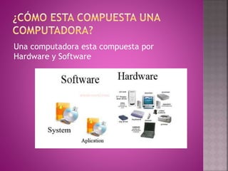 El documento describe los componentes principales de una computadora. Explica que una computadora está compuesta de hardware y software. El hardware incluye la CPU, memoria y periféricos como dispositivos de entrada, salida y almacenamiento. El software incluye software de sistema como el sistema operativo, software de programación y software de aplicaciones como Word. El sistema operativo permite que la computadora y hardware funcionen y comprendan las instrucciones del usuario.