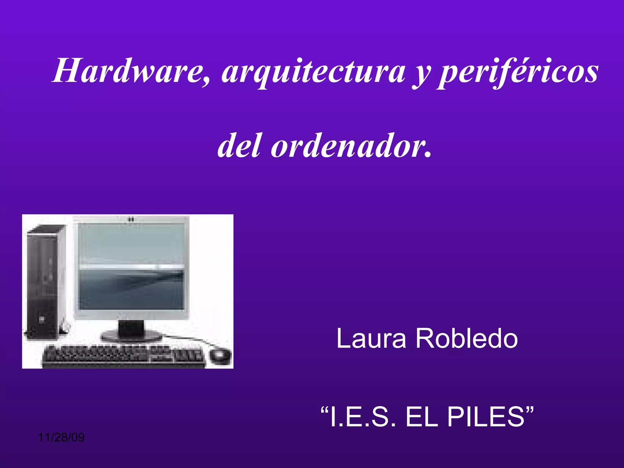Este documento describe los componentes fundamentales de un ordenador, incluyendo el software, hardware, periféricos y arquitectura interna. Explica que el software se divide en sistema, programación y aplicaciones, y el hardware incluye la unidad central de procesamiento, memoria, placa base y tarjetas de expansión. También describe los diferentes tipos de periféricos de entrada, salida y entrada/salida y sus funciones.