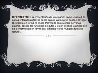 El documento habla sobre hipertexto y cómo permite presentar la información de forma no lineal a través de nodos enlazados, permitiendo la coexistencia de varios autores y múltiples rutas de lectura.