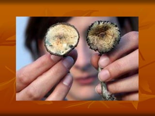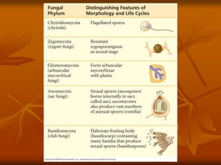 Este documento proporciona una introducción al reino Fungi. Los hongos son eucariotas heterótrofos que adquieren nutrientes por absorción. Se estima que hay alrededor de 1,5 millones de especies de hongos, que desempeñan un papel esencial en la descomposición y el reciclaje de nutrientes en los ecosistemas. Los hongos pueden ser filamentosos o unicelulares, y muchos forman relaciones mutualistas con plantas y animales. Los hongos se clasifican en varios filos