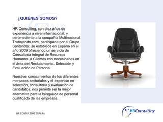 HR Consulting España ofrece servicios de consultoría de recursos humanos como búsqueda y selección de ejecutivos y personal cualificado, evaluaciones individuales, assessment centers, outsourcing de procesos de selección, y consultoría general de RRHH. Con diez años de experiencia internacional, la compañía se estableció en España en 2009 y se especializa en la búsqueda de talento ejecutivo y la adaptación de soluciones de selección a las necesidades específicas de cada cliente.