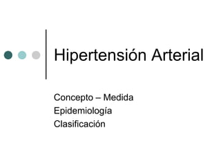 El documento define hipertensión arterial, discute su epidemiología incluyendo tasas de prevalencia, tratamiento y control, y clasifica la hipertensión en primaria versus secundaria y por niveles de presión arterial. Además, explica los objetivos del examen clínico de pacientes hipertensos, como determinar si la hipertensión es persistente, si existe una causa curable, y evaluar otros factores de riesgo cardiovascular.