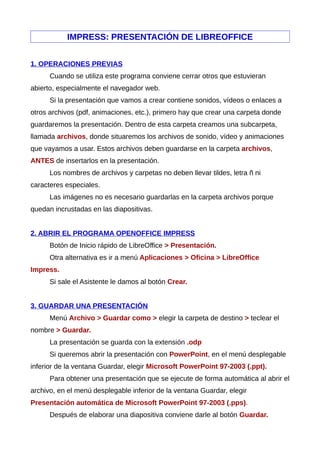 Este documento proporciona instrucciones para crear y editar presentaciones en LibreOffice Impress. Explica cómo abrir el programa e insertar diapositivas, cuadros de texto, imágenes, sonidos y videos. También cubre cómo aplicar transiciones, animaciones y fondos a las diapositivas. El documento contiene 28 secciones con pasos detallados para realizar diferentes tareas en Impress como guardar una presentación, cambiar el orden de las diapositivas, agregar notas y ejecutar una presentación.