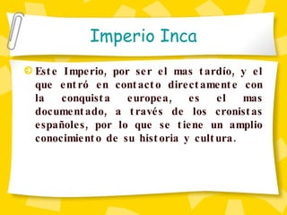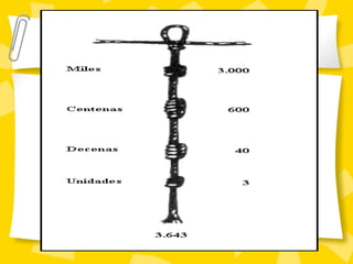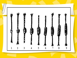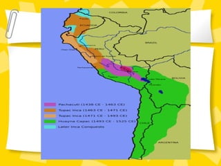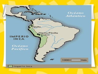 El documento resume la ubicación y expansión del Imperio Inca. Los Incas originalmente eran una pequeña tribu en Perú que eventualmente construyó un imperio que se extendió desde Colombia hasta Argentina. Aunque los Incas no tenían un sistema de escritura, desarrollaron un sistema numérico decimal y usaban el quipu, cuerdas con nudos de colores, para registrar información numérica.
