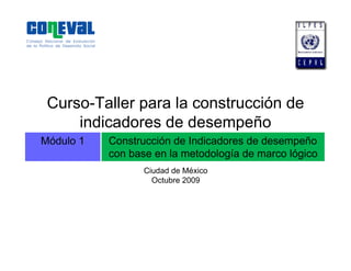 Este documento presenta información sobre la construcción de indicadores de desempeño basados en la metodología del marco lógico. Explica por qué son necesarios los indicadores y cómo se relacionan con los tomadores de decisiones y el proceso presupuestario. Además, define qué son los indicadores, clasifica los tipos de indicadores según lo que miden y la etapa del proceso productivo, y describe los pasos para construir un indicador, incluyendo analizar el objetivo, seleccionar aspectos a medir, formular el nombre e fórmula