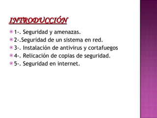 Este documento describe varios aspectos de la seguridad informática, incluyendo las amenazas a los sistemas, medidas de seguridad como antivirus y cortafuegos, realización de copias de seguridad, y riesgos en Internet como virus y correo electrónico no deseado. La seguridad busca proteger la confidencialidad, integridad y disponibilidad de la información. Algunas amenazas comunes incluyen virus, malware, intrusos y fallos de hardware o software.