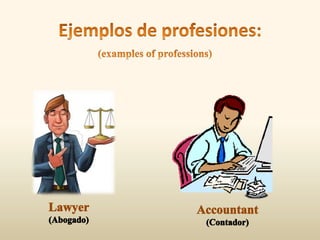 Este documento discute las diferencias entre profesiones y ocupaciones en inglés. Explica que una profesión requiere un título universitario mientras que una ocupación no. Luego proporciona ejemplos de cómo preguntar y responder sobre la profesión u ocupación de alguien usando el verbo "to be" y el artículo "a" u "an".