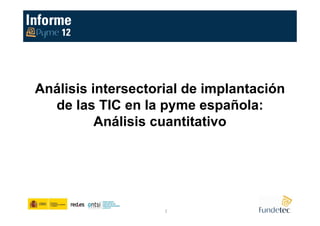 Este documento presenta los resultados de un análisis cuantitativo y cualitativo del uso de las TIC en 10 sectores productivos en España. El análisis cuantitativo muestra los niveles de equipamiento básico como ordenadores, teléfonos móviles e internet, así como el uso de páginas web, software libre y redes sociales. El análisis cualitativo incluye entrevistas para evaluar el impacto de las TIC, las barreras y oportunidades. Finalmente, se ofrecen recomendaciones como promover la formación