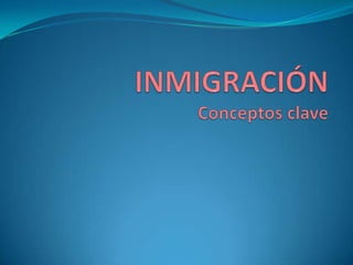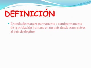 La inmigración se refiere a la entrada permanente o semipermanente de personas en un país desde otros países. Los motivos de la inmigración incluyen razones políticas, económicas y de persecución. Existen diferentes tipos de migraciones como las migraciones internas, externas, temporales y permanentes. La inmigración tiene varios efectos como la concentración de población en áreas urbanas y el aumento de la natalidad en el país receptor. En España, tradicionalmente fue un país emigrante pero ahora recibe una gran cantidad de