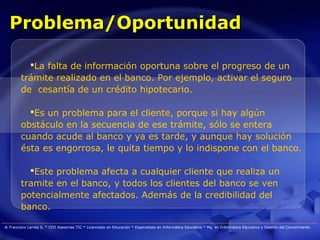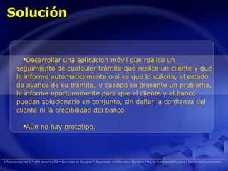 Este documento propone el desarrollo de una aplicación móvil que permita a los clientes del banco realizar un seguimiento automático del estado de sus trámites y ser informados oportunamente de cualquier obstáculo. Actualmente, los clientes solo se enteran de problemas cuando acuden al banco, lo que genera molestias. La aplicación mejoraría la transparencia y credibilidad del banco. Francisco Larrea lideraría el proyecto como especialista en tecnologías de la información.
