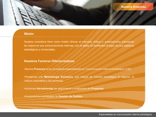 La consultora ofrece soluciones de comunicación interna estratégica para mejorar los objetivos comerciales y estratégicos de las empresas en Chile y Sudamérica. Cuenta con una metodología exclusiva que integra el negocio, la cultura y las personas, e incluye herramientas de seguimiento y gestión del cambio. Su equipo profesional tiene experiencia nacional e internacional en el sector público y privado.