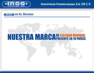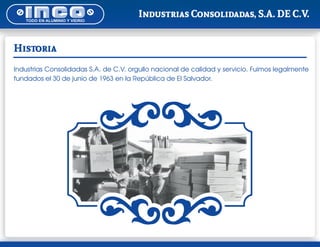 Industrias Consolidadas, S.A. de C.V. es una empresa fundada en 1963 en El Salvador que fabrica escaleras, ventanas, puertas y otros productos de vidrio, aluminio y fibra de vidrio. La compañía tiene instalaciones en Soyapango que incluyen plantas para procesar vidrio, fabricar escaleras e industrias livianas, así como bodegas para almacenar perfiles, accesorios, vidrio y productos terminados. Industrias Consolidadas se enorgullece de aplicar controles de calidad estrictos y