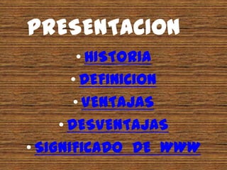 El documento presenta información sobre Danny Ismael Cunalata Cando, un estudiante avanzado en el Centro de Capacitación Ocupacional CICAP. Su horario es los sábados de 2:30 a 5:30 pm y vive en Sigualo Alto. El documento también resume brevemente la historia, definición, ventajas y desventajas de Internet, así como el significado de WWW.