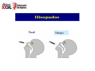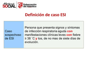 Este documento trata sobre la definición de casos de infección respiratoria aguda (IRAG) y enfermedad tipo influenza (ESI) así como los métodos de diagnóstico para estas infecciones. Describe brevemente las pruebas rápidas, inmunofluorescencia, aislamiento viral y técnicas moleculares como PCR y rRT-PCR que se usan para diagnosticar estas infecciones respiratorias. También discute cómo se deben tomar las muestras de hisopado de garganta para pacientes ambulatorios y muestras respir