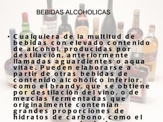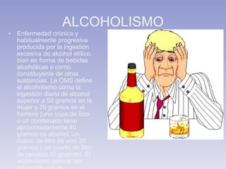 Las bebidas alcohólicas son líquidos producidos por la destilación de otras bebidas fermentadas como el vino o las melazas, resultando en un alto contenido de alcohol. El alcoholismo se define como la ingestión excesiva de alcohol y se caracteriza por la dependencia emocional y física al alcohol, pudiendo causar daños cerebrales y la muerte. El tratamiento del alcoholismo incluye terapias individuales y de grupo para lograr la abstinencia de forma voluntaria.