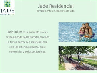 Jade Tulum es un proyecto residencial ubicado a minutos de las playas de Tulum, en la Riviera Maya. El proyecto ofrece casas para habitar permanentemente o como residencias vacacionales, en un ambiente tranquilo y seguro rodeado de selva tropical. Jade Tulum cuenta con 4 modelos de casas, seguridad, alberca, ciclopista y áreas comerciales. Los precios van desde $59,000 hasta $129,000 dólares estadounidenses.