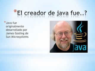 Java fue originalmente desarrollado por James Gosling de Sun Microsystems en 1991. Es un lenguaje de programación orientado a objetos que se utiliza comúnmente en dispositivos móviles, sistemas empotrados, navegadores web, sistemas de servidor y aplicaciones de escritorio. Java es importante porque es un lenguaje de alto nivel que soporta objetos, clases, métodos, herencia y encapsulamiento.