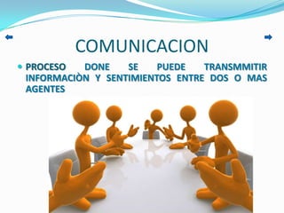 La comunicación es un proceso mediante el cual se transmite información y sentimientos entre dos o más agentes. Existen categorías del principio de cooperación como la máxima de cantidad, calidad, relación y manera. La comunicación no verbal incluye la interacción a través de gestos, lenguaje corporal, expresión facial y contacto visual, mientras que la oralidad es una forma natural y elemental del lenguaje humano.