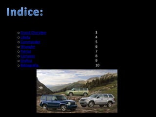 Este documento resume las especificaciones técnicas de varios modelos de Jeep, incluyendo el motor, caballos de fuerza, transmisión, sistema 4x4 y torque. Proporciona esta información para los modelos Grand Cherokee, Liberty, Commander, Wrangler, Patriot y Compass. También incluye un gráfico de las camionetas más vendidas en los Estados Unidos y una sección de bibliografía.