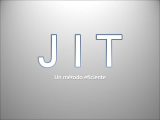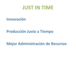 El documento describe los beneficios del sistema de producción Justo a Tiempo (JIT), incluyendo el uso más eficiente de recursos, aumento de la productividad y disminución de los tiempos de producción. Explica las etapas para implementar JIT, como comprender los conceptos básicos, comprometerse, realizar un análisis de costo-beneficio y seleccionar un equipo piloto. También menciona como compañías como Toyota, Dell y General Motors han aplicado con éxito el sistema JIT.
