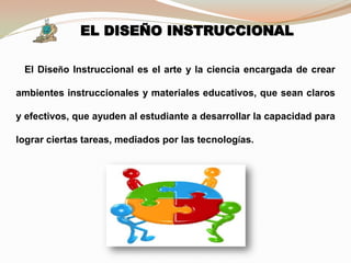 Este documento trata sobre el diseño instruccional y los ambientes tecnológicos de aprendizaje. Explica que el diseño instruccional utiliza modelos como guías para crear instrucciones sistemáticas basadas en teorías del aprendizaje. También describe los ambientes tecnológicos de aprendizaje y sus características, así como las ventajas y limitaciones del diseño instruccional.