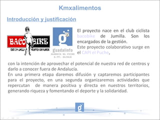 Este documento describe el proyecto colaborativo "Kmxalimentos" entre el club ciclista Bacobike de Jumilla y el CAPI El Puche. El proyecto tiene como misión ayudar a familias necesitadas mediante la recaudación de alimentos a través de la práctica deportiva y el registro de kilómetros en la aplicación Endomondo. Los alimentos recolectados se entregarán a Cruz Roja de Jumilla para su distribución. Adicionalmente, se organizarán carreras populares para promover el deporte y la solidaridad en los