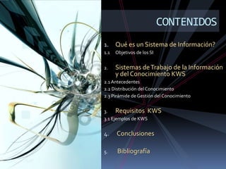 Este documento describe los sistemas de trabajo de la información y el conocimiento (KWS), los cuales son sistemas de información que apoyan a los trabajadores del conocimiento en la creación e integración de nuevo conocimiento en una organización. Explica que los trabajadores del conocimiento requieren herramientas como hardware, software y plataformas de comunicación para desarrollar su trabajo y crear conocimiento. También señala que estos trabajadores deben mantener actualizado el conocimiento de la organización y actuar como agentes de cambio al evaluar e iniciar proyect