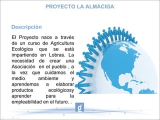El documento describe un proyecto llamado "La Almáciga" en Lobras. El proyecto nace de un curso de agricultura ecológica impartido en el pueblo, con el objetivo de crear una asociación para cultivar productos ecológicos, aprender habilidades para el empleo futuro y cuidar el medio ambiente. El proyecto involucra al Centro Guadalinfo de Lobras y varias asociaciones locales. Sus objetivos son fomentar una mentalidad ecológica, elaborar productos con frutos cultivados