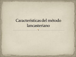 Este documento describe el método educativo lancasteriano, desarrollado por Joseph Lancaster a principios del siglo XIX. Se caracterizaba por utilizar monitores estudiantiles para enseñar a grandes grupos de alumnos de forma simultánea, dividiéndolos en filas y utilizando pizarras. Aunque tuvo éxito inicialmente por su bajo costo, con el tiempo surgieron problemas como la falta de capacitación de los monitores y el escaso control sobre los estudiantes.