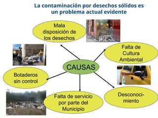 La contaminación por desechos sólidos es un problema grave, resultado de la mala disposición de residuos y falta de cultura ambiental, que genera impactos negativos en el medio ambiente y la salud. El manejo integral de desechos sólidos implica actividades de recolección, separación y reciclaje, y se deben aplicar las 5 Rs (reducir, reutilizar, reciclar, rechazar y recuperar) para mitigar esta problemática. Es fundamental que las personas asuman la responsabilidad de sus desechos y promuevan prácticas que protejan el medio ambiente.