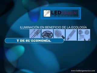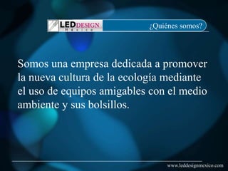 Este documento presenta a una empresa dedicada a promover el uso de equipos de iluminación LED amigables con el medio ambiente. La empresa ofrece asesoría profesional para proyectos de iluminación LED y cuenta con personal capacitado en diseño, arquitectura e ingeniería eléctrica. Los LED tienen ventajas ecológicas como menor consumo eléctrico y ser completamente reciclables, y ventajas económicas como bajo costo y larga vida útil.