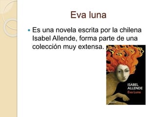 La novela Eva Luna cuenta la historia de una mujer llamada Eva. Eva creció sin familia y trabajó como sirvienta en varias casas donde experimentó maltrato y abuso. A lo largo de su vida, Eva conoció a varios hombres pero ninguna relación resultó en amor verdadero o felicidad duradera. Finalmente, Eva escapa de su país natal para comenzar una nueva vida.