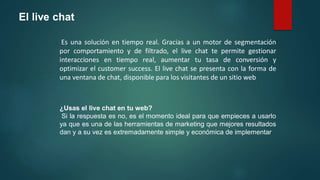 Este documento presenta información sobre el uso de live chat en sitios web. Describe que el live chat permite gestionar interacciones en tiempo real para aumentar conversiones y optimizar el éxito del cliente. Recomienda hacer visible el botón de live chat para ofrecer una mejor experiencia de usuario a través de conversaciones directas que resuelvan dudas o consultas.