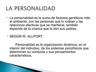 El documento resume los conceptos básicos de la psicología de la personalidad. Explica que la personalidad está determinada por factores biológicos, ambientales y de madurez/conciencia. Se definen conceptos como rasgos de personalidad, carácter, temperamento e inteligencia como constituyentes clave de la personalidad. Además, se describen factores como la herencia, el aprendizaje y el ambiente como influencias en el desarrollo de la personalidad.