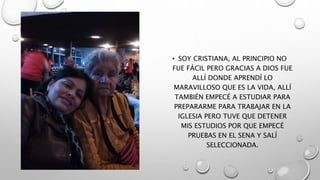 Marisol Bermúdez da gracias a Dios por su existencia. Tiene 42 años y vive en Bogotá desde los 14 años, donde se ha convertido en cristiana y ha aprendido el valor del amor a través de Dios. Tiene tres hijos y vive actualmente en Ciudad Montes. Considera a Dios como su verdadero amor y fortaleza en los momentos difíciles, quien le ha enseñado a perdonar, ser humilde y obediente.