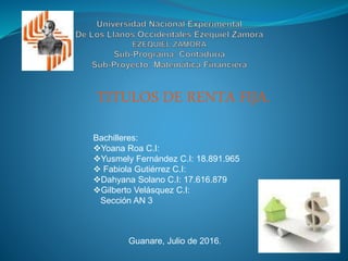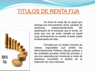 El documento contiene información sobre títulos de renta fija y variable. Explica que los títulos de renta fija ofrecen una tasa de interés fija e independiente de los resultados de la empresa emisora, mientras que los de renta variable ofrecen dividendos variables que dependen de las ganancias de la empresa. Entre los instrumentos de renta fija se encuentran los certificados bancarios, papeles comerciales y bonos públicos emitidos por gobiernos.