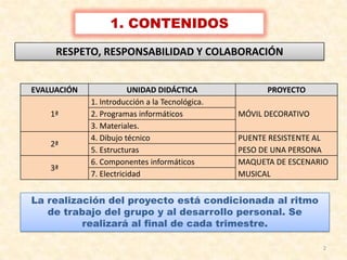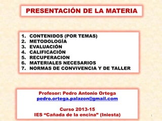 Este documento presenta la materia de Tecnología para el curso 2013-15 en el IES "Cañada de la encina". Incluye una introducción a los contenidos organizados en tres evaluaciones trimestrales, la metodología basada en explicaciones, trabajos individuales y en grupo, y la evaluación continua. También detalla los requisitos de materiales, calificaciones, y normas de conducta para el aula y el taller.