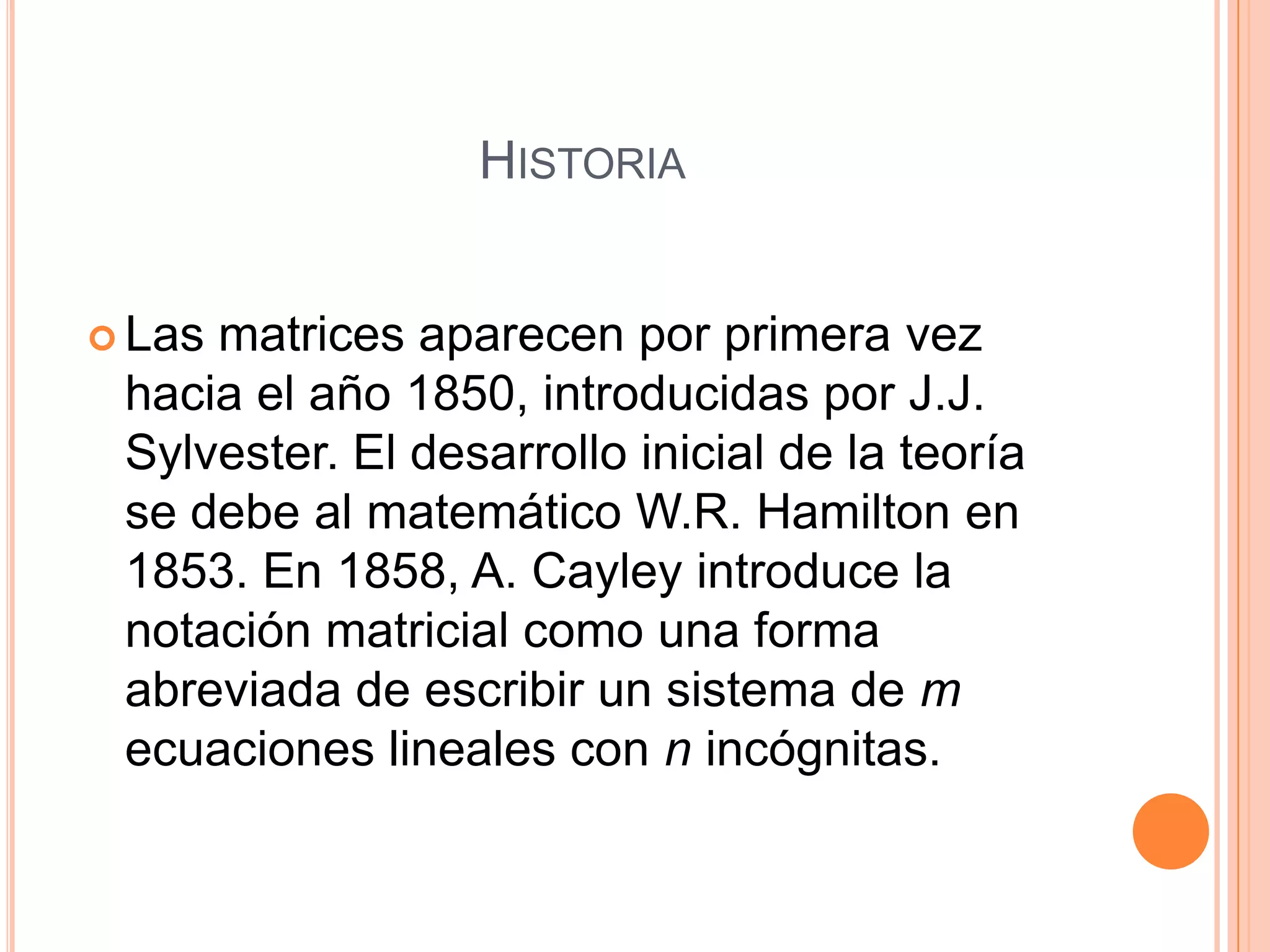 Este documento resume la historia y definición de las matrices, incluyendo diferentes tipos como matrices cuadradas, nulas e identidad. Explica cómo se pueden usar matrices para representar transformaciones como traslación, escalado y rotación en 2D y 3D, y cómo la composición de transformaciones se puede lograr mediante el producto de matrices. Finalmente, discute cómo las matrices se implementan eficientemente en computadoras para gráficos 3D.