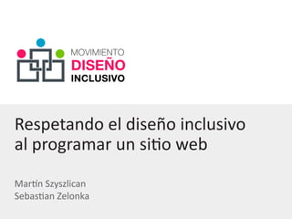 Este documento presenta los principios del diseño inclusivo de sitios web, incluyendo la importancia de hacerlos accesibles para todos los usuarios, cómo lograr la accesibilidad siguiendo estándares como WCAG, y cómo evitar problemas comunes como formularios y navegación no accesibles. También proporciona ejemplos de código HTML accesible y no accesible, y recursos adicionales para aprender sobre el tema.