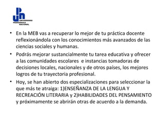 El documento describe la Maestría en Educación Básica (MEB) ofrecida por la Universidad Pedagógica Nacional de Morelia, Michoacán. La MEB está dirigida a docentes de preescolar, primaria y secundaria y les permite mejorar su práctica docente a través de dos especializaciones en dos ciclos anuales en áreas como enseñanza del lenguaje o habilidades del pensamiento. La maestría ofrece a los docentes desarrollar su trayectoria profesional y generar alternativas frente a los ret