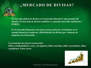El mercado de divisas o mercado cambiario es el mercado más activo del mundo en el que individuos, empresas, bancos e instituciones gubernamentales compran y venden distintas monedas extranjeras, permitiendo transferir fondos o poder adquisitivo de un país a otros y brindando la posibilidad de efectuar pagos internacionales.