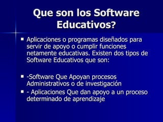 Este documento describe los conceptos básicos sobre los software educativos. Explica que existen dos tipos de software educativos: los que apoyan procesos administrativos o de investigación, y los que dan apoyo a procesos de aprendizaje. También describe las características de los software educativos como su finalidad didáctica, la interactividad con el estudiante, e independencia en el ritmo de aprendizaje. Finalmente, discute la importancia de la tecnología en la educación como una herramienta para mejorar la motivación, representación de