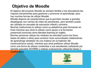Moodle es un sistema de gestión de cursos de código abierto gratuito que los educadores pueden usar para crear sitios de aprendizaje en línea. Moodle permite escalar desde grandes instituciones con cientos de miles de estudiantes hasta escuelas pequeñas, y puede usarse como plataforma de aprendizaje en línea o para complementar la enseñanza presencial. El objetivo de Moodle es promover una pedagogía constructivista social a través de características como la colaboración, actividades y reflexión crítica.