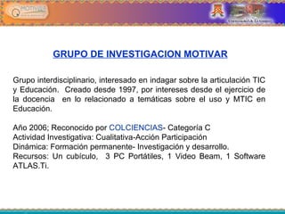 El Grupo de Investigación Motivar de la Universidad de La Guajira se formó en 1997 para investigar la articulación entre las TIC y la educación. Ha desarrollado varios proyectos con el Ministerio de Educación Nacional y otras instituciones para promover el uso de las TIC en la educación básica, media y superior a través de comunidades virtuales de aprendizaje, el uso de computadores portátiles y la construcción de portafolios digitales. El grupo cuenta con recursos limitados pero sigue trabajando para fortalecer la investigación e implementación de