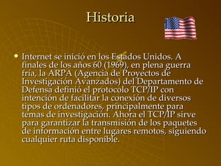 Internet se originó en Estados Unidos a finales de los años 60 como una red de comunicaciones militares llamada ARPANET, utilizando el protocolo TCP/IP. Actualmente, Internet es la mayor red de computadoras y personas interconectadas que permite compartir y publicar información de forma global. Sirve para comunicarnos, aprender, entretenernos y conocer gente de todo el mundo a través de páginas web, correo electrónico y redes sociales.